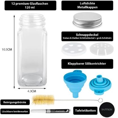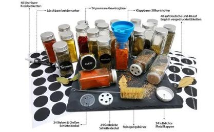 Δεν παίρνετε απλώς 24 υπέροχα βάζα μπαχαρικών, αλλά ένα πλήρες σετ στο οποίο θα βρείτε όλα όσα χρειάζεστε. Περιλαμβάνονται 48 προτυπωμένα στρογγυλά αυτοκόλλητα με τα ονόματα των μπαχαρικών στα γερμανικά, 48 προτυπωμένα στρογγυλά αυτοκόλλητα με τα ονόματα των μπαχαρικών στα γαλλικά και 48 κενά στρογγυλά αυτοκόλλητα που μπορείτε να γράψετε με το στυλό κιμωλίας υψηλής ποιότητας που περιλαμβάνεται.