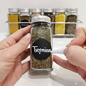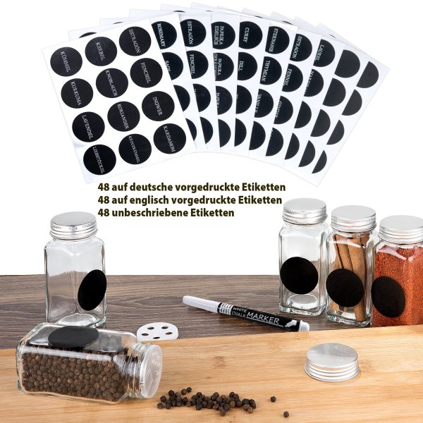 • ΕΤΙΚΕΤΕΣ ΓΙΑ ΤΑ ΜΠΑΧΑΡΙΚΑ ΣΑΣ! – Το σετ με βαζάκια μπαχαρικών διαθέτει καπάκι και περιλαμβάνει επίσης 48 ετικέτες στα γαλλικά και γερμανικά με τυπωμένα τα ονόματα των πιο συνηθισμένων μπαχαρικών και 48 κενές ετικέτες που μπορείτε να γράψετε με το στυλό κιμωλίας που περιλαμβάνεται.