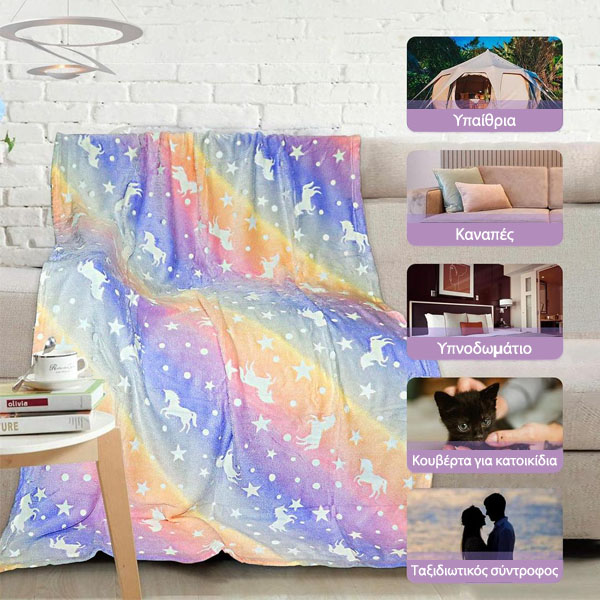 Μια ζεστή και άνετη κουβέρτα εκπέμπει φως κατά τη διάρκεια της νύχτας! Μπορείτε να επιλέξετε σχέδιο μονόκερου ή δεινοσαύρου!